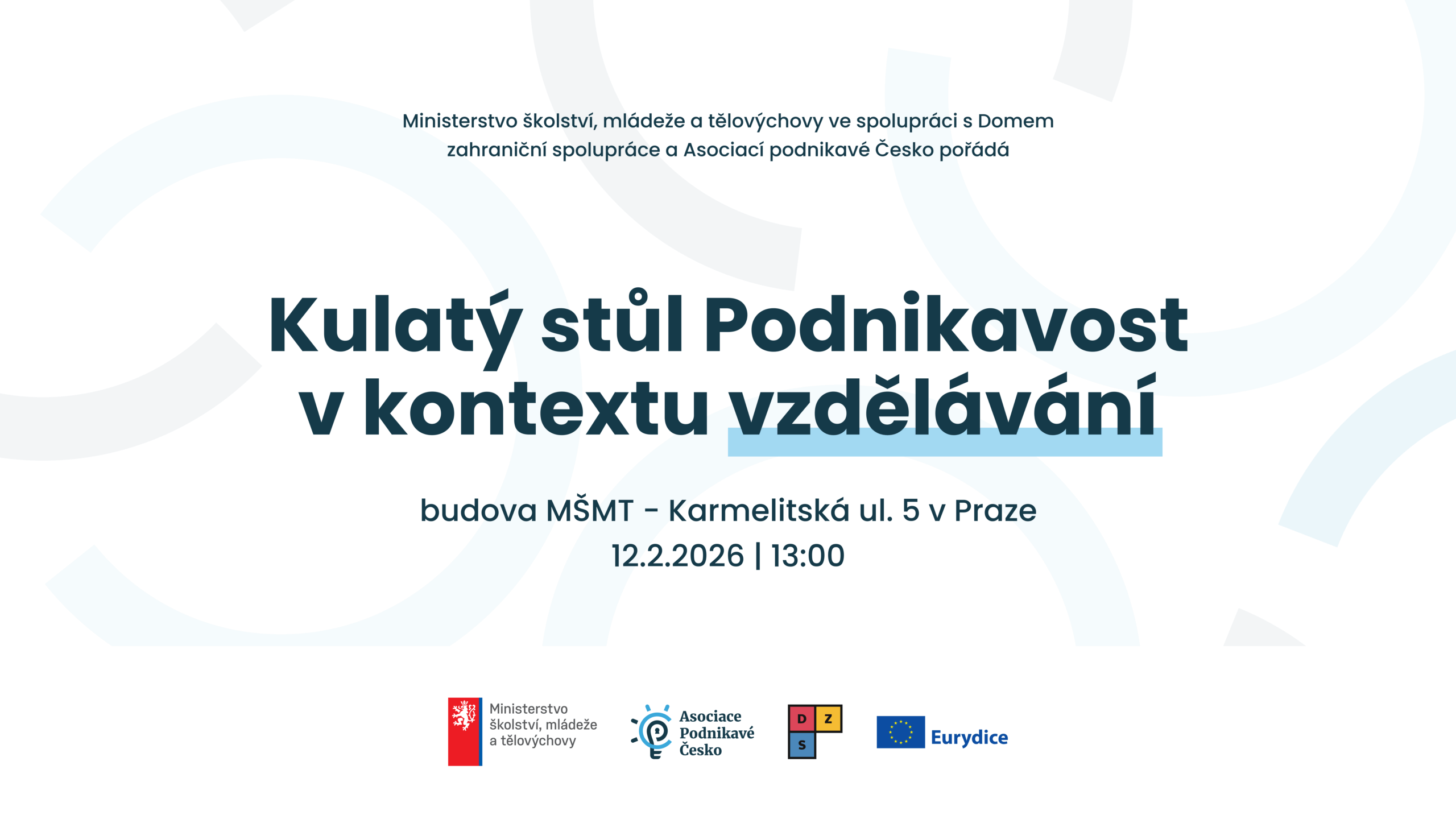 Ministerstvo školství, mládeže a tělovýchovy ve spolupráci s Domem zahraniční spolupráce a Asociací podnikavé Česko pořádá odborný kulatý stůl Podnikavost v kontextu vzdělávání, který se uskuteční ve čtvrtek 12. února 2026 od 13.00 do 15.30 v budově MŠMT, Karmelitská 5, Praha 1.